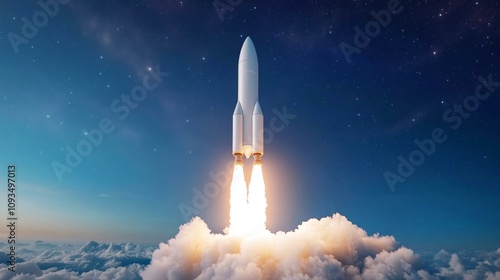 Fototapeta premium Rocket launching into starry night sky with glowing exhaust and cloudscape