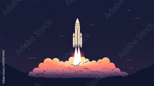 © warunthorn, Obraz premium Rocket Launching into the Night Sky with Colorful Clouds Below