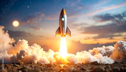 © tukang, Fototapeta premium Rocket Taking Off at Sunset with Fiery Exhaust and Dramatic Sky