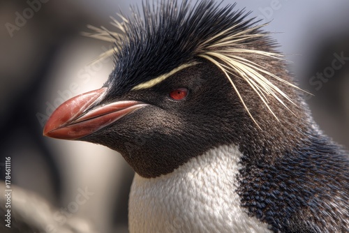 © Ifti Digital, Naklejka premium Rockhopper penguin exhibiting distinctive features in a natural habitat setting during the morning light in the Southern Hemisphere