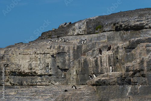 © JeremyRichards, Naklejka premium Rockhopper Penguins (Eudyptes chrysocome) heading to sea from a rocky outcrop on the coast of Bleaker Island in the Falkland Islands.