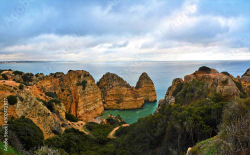 Obraz premium Rocky beach in Lagos - Portugal on a cloudy day 31.Oct.2019