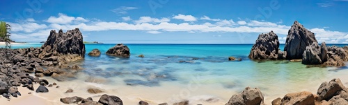 Fototapeta premium Rocky beach with clear blue water and clouds.