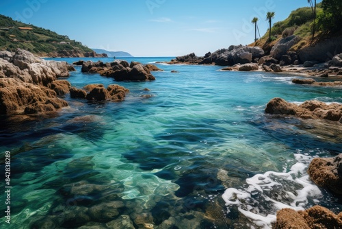 Fototapeta premium Rocky Beach with natural pools full of marine life., generative IA