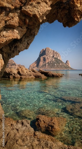 © Opal, Fototapeta premium Rocky cave entrance frames a distant island peak with serene turquoise water. A stunning coastal vista evokes tranquility