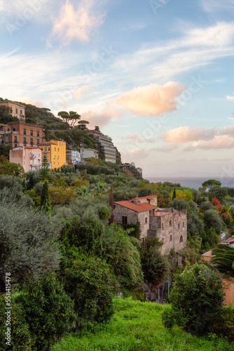 Obraz premium Rocky Coast and Homes in Touristic Town, Sorrento, Italy. Amalfi Coast. Colorful Sunset Sky