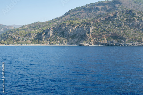 Fototapeta premium Rocky coastline and deep blue sea at Sougia beach upon the southern coast of...
