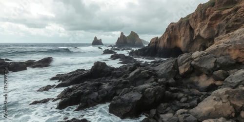 © Habibur Rahaman, Obraz premium Rocky coastline with crashing waves and dramatic cliffs under a cloudy sky landscape photo