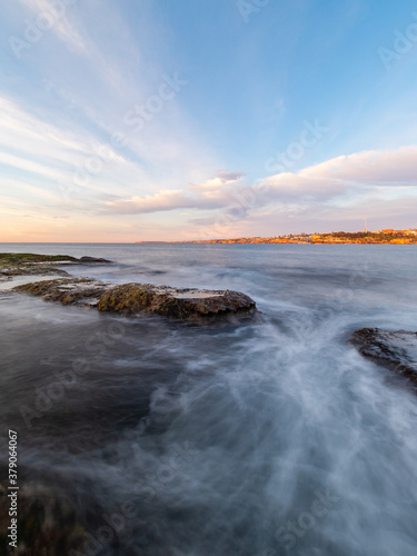 © AlexandraDaryl, Obraz premium Rocky coastline with sea water flowing under the cloudy sky.
