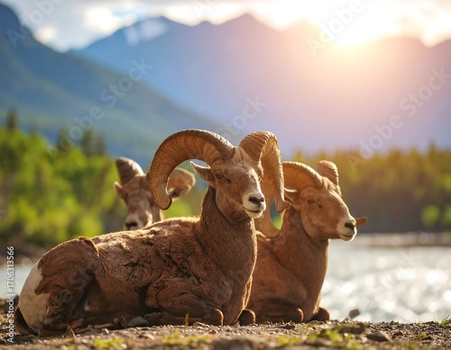Naklejka premium Rocky Mountain Bighorn Sheep resting by a river (1)