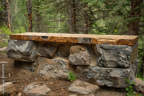 © Suphakorn, Obraz premium Rocky mountain ledge with a timber podium, offering a sturdy, robust setting for rugged outdoor equipment