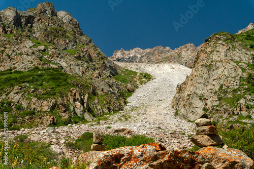 © Andrei, Naklejka premium Rocky mountain pass with steep slopes, scattered cairns, scree field, lush green patches, blue sky, rugged terrain, alpine environment, popular hiking and mountaineering destination, summer season