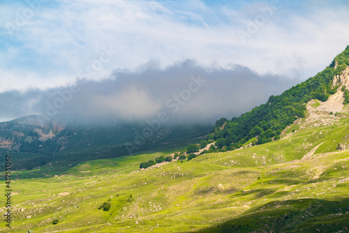 © Vastram, Obraz premium Rocky mountain range with trees and clouds