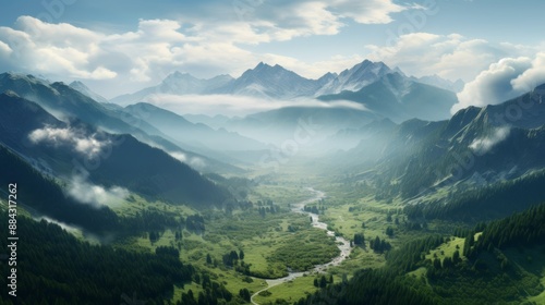Fototapeta premium Rocky mountain terrain with lush green valleys, morning mist, soft lighting