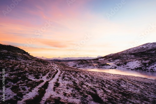 Fototapeta premium Rocky mountains covered with snow during scenic pink sunset, Tromso, Norway