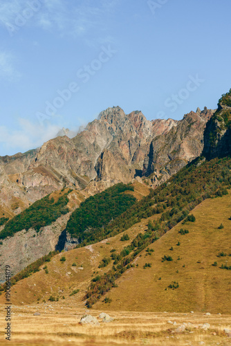© fotofabrika, Fototapeta premium Rocky mountains rise above grassy fields in the daytime sunshine