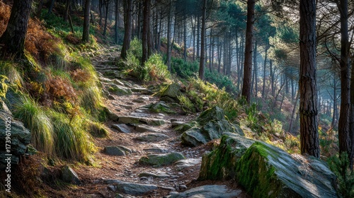 © Adi, Fototapeta premium Rocky path winding through a dense sunlit forest