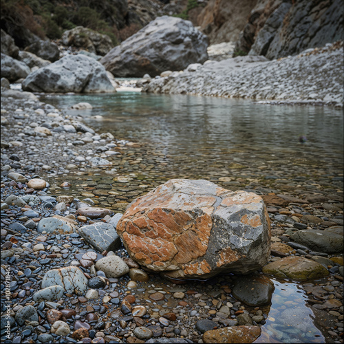 © Hamza, Fototapeta premium Rocky riverbed with a large boulder in a mountainous landscape