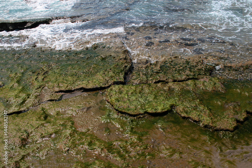 Obraz premium Rocky seashore overgrown with young algae.