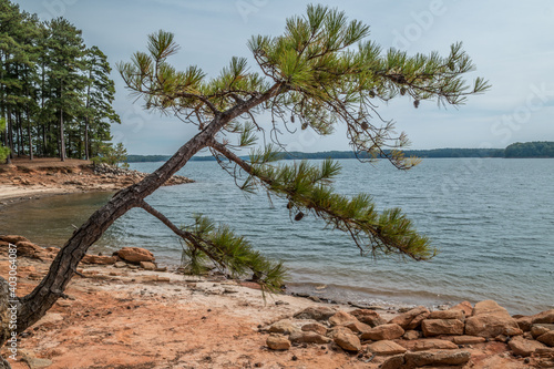 Obraz premium Rocky shoreline with falling tree