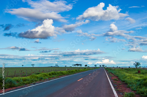 Fototapeta premium Rodovia entre pastagens verdes e céu azul com nuvens em Minas Gerais.