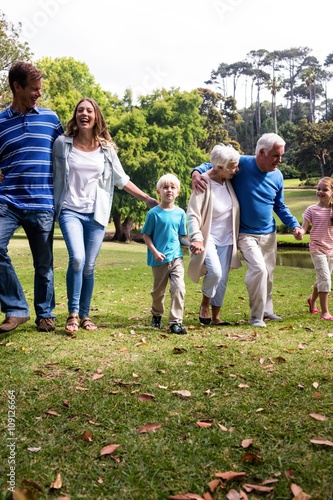 Fototapeta premium Rodzina wielopokoleniowa spacerująca po parku