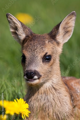 © slowmotiongli, Fototapeta premium Roe Deer, capreolus capreolus, Portrait of Foan with Flowers, Normandy