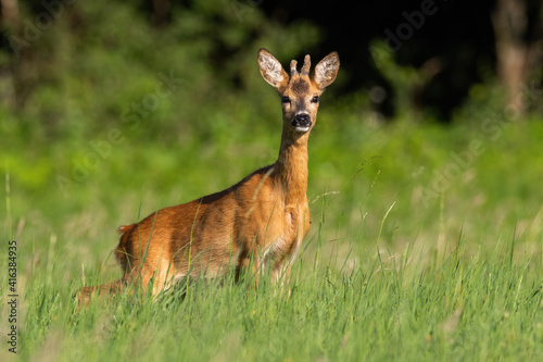 © WildMedia, Fototapeta premium Roe deer, capreolus capreolus, standing on pasture in summertime sunlight. Young roebuck with growing antlers wrapped in velvet looking on grass. Male animal staring on meadow.