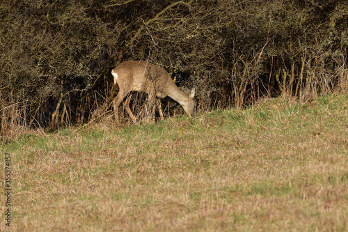 Obraz premium Roe deer with antlers in growth comes from dense bushes to graze in spring
