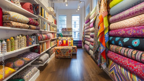 © PaulShlykov, Fototapeta premium Roll of fabric, batik floral style print fabric cotton for making apparel, fabric roll in textile business, fabric store supplier, material for clothing industry.