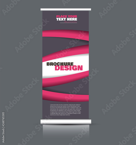 © Natalie Adams, Fototapeta premium Roll up banner design. Vertical narrow flyer template. Advertising panel layout. Grey and pink vector illustration.