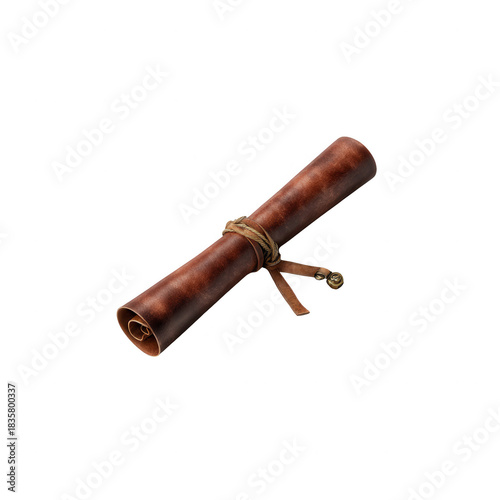 © Kamonwan, Obraz premium Rolled brown leather scroll tied with twine and brass charm, vintage parchment inside, rustic stationery accessory, cozy warm texture and nostalgic mood