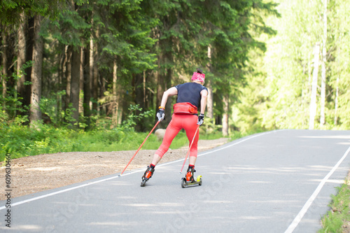 © Александр Поташев, Fototapeta premium Roller skis.A woman runs in a summer park on roller skis.Cross country skilling.