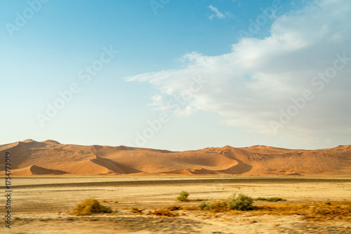 Fototapeta premium Rolling desert dunes near North Windhoek, Namibia, stretch beneath a dramatic...