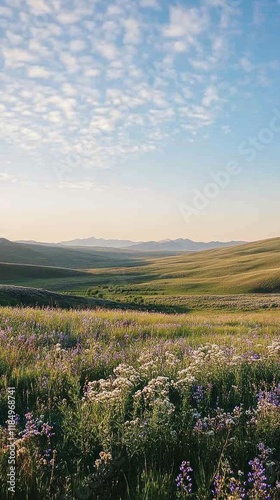 Fototapeta premium Rolling fields adorned with delicate wildflowers create a harmonious blend of...