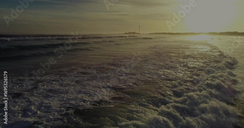 Fototapeta premium Rolling foamy ocean waves catching golden sunset light at beach viewpoint, coastal seascape
