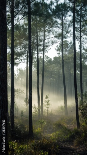 © Postproduction, Fototapeta premium Rolling fog drifting through a dense pine forest, mysterious atmosphere. Vertical