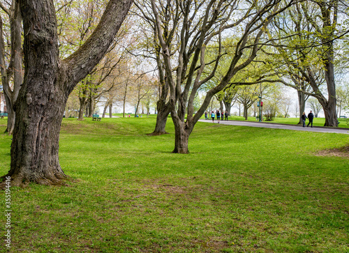 Fototapeta premium Rolling grassy hill and trees in Battlefields Park with a view overlooking Quebec, Canada.