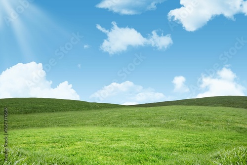 Obraz premium Rolling grassy hills are being shown in flat design with scattered white clouds and sun rays
