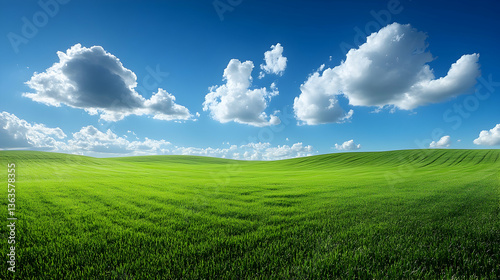 Fototapeta premium Rolling green field under a blue sky with fluffy white clouds