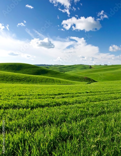 © Anggacs, Naklejka premium Rolling green fields under a vibrant sky