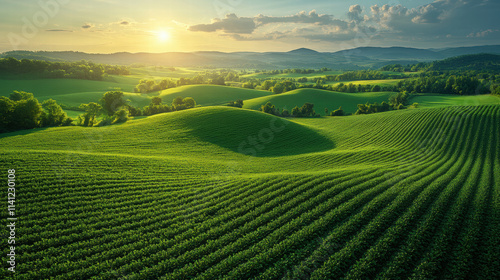 © Lightflow Vision , Naklejka premium Rolling green fields with vibrant crops under golden sunset, surrounded by hills
