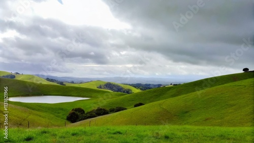 Fototapeta premium Rolling Green Hills and a Lone Reflective Pond Under a Moody Sky for Scenic...