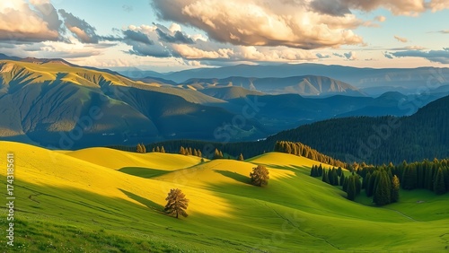 Obraz premium Rolling Green Hills and Distant Mountains Under a Cloudy Sky At Golden Hour Glow