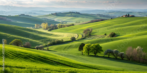 © MD, Fototapeta premium Rolling green hills and farmland under a bright sky.