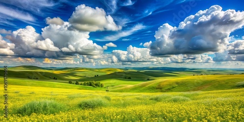 Obraz premium Rolling Green Hills and Fluffy Clouds, Landscape Photography, Lush Fields,...