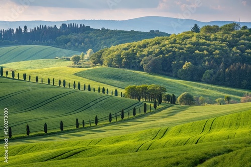 Fototapeta premium Rolling Green Hills and Trees Under a Cloudy Sky Generative AI