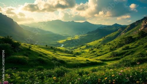 © Umma, Obraz premium Rolling Green Hills And Valley Landscape With River Under Golden Sunlight Scenery