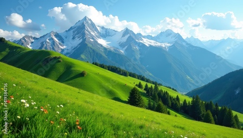 Fototapeta premium Rolling green hills ascend to snow-covered Parang summits Breathtaking...
