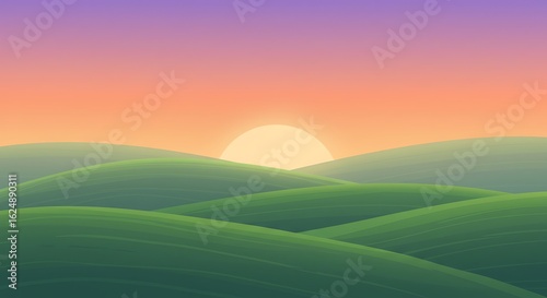Fototapeta premium Rolling Green Hills at Sunset - Serene Landscape Illustration